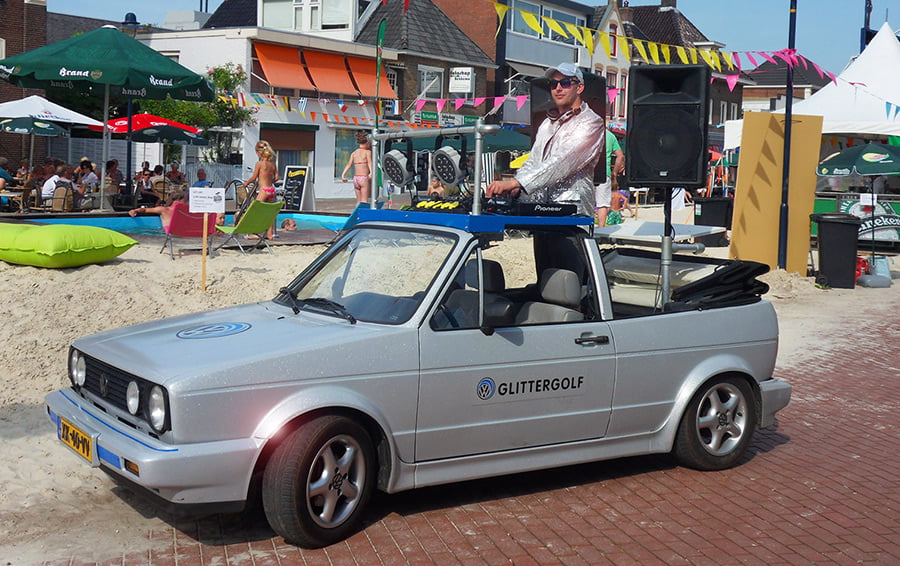 Naast de T1 bus en Kever mag Volkswagen zich prijzen met nog een bekende en uiterst geliefde serie: de Golf. GlitterGolf mag zich als cabrio rekenen tot de originele serie met de karakteristieke hoekige lijnen. Geheel voorzien van zilveren glitters is deze DJ wagen een opvallende verschijning.